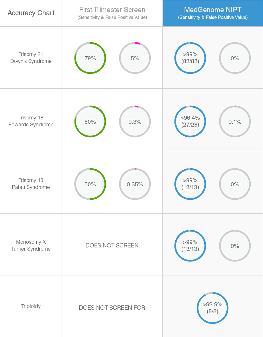 Claria NIPT screens for more chromosomal abnormalities with greater accuracy. Compared to first trimester screenings Claria NIPT has higher sensitivity and low false positive rate for the conditions screened.